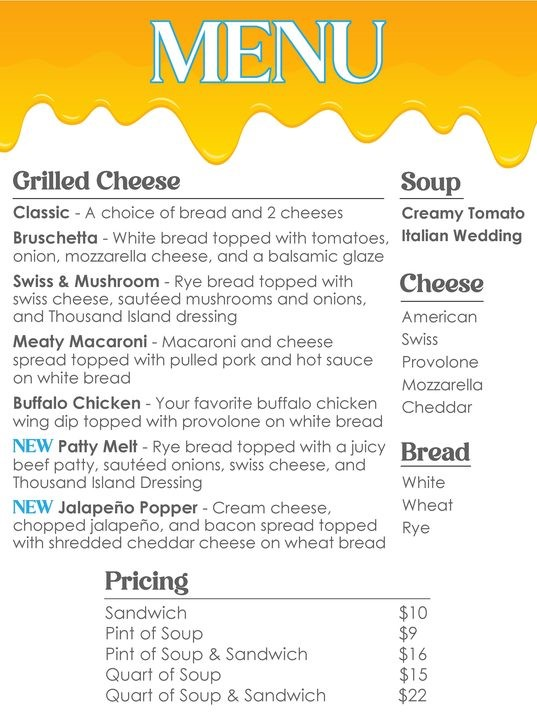 Enjoy a wide variety of gourmet grilled cheese sandwiches, from Buffalo Chicken to Bruschetta, and a side of creamy tomato soup.
