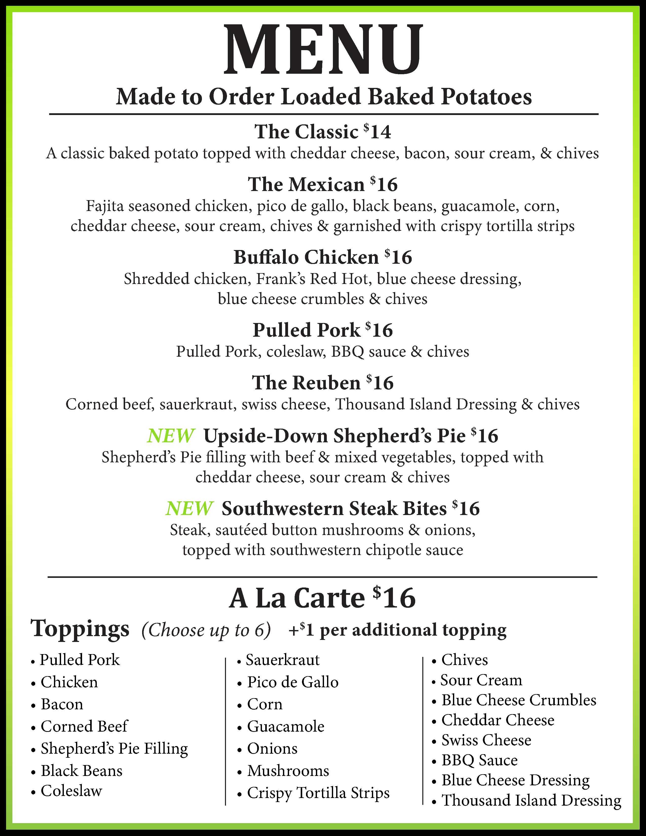 Join us for Loaded Potatoes with plenty of topping selections, from Mexican to Pulled Pork.