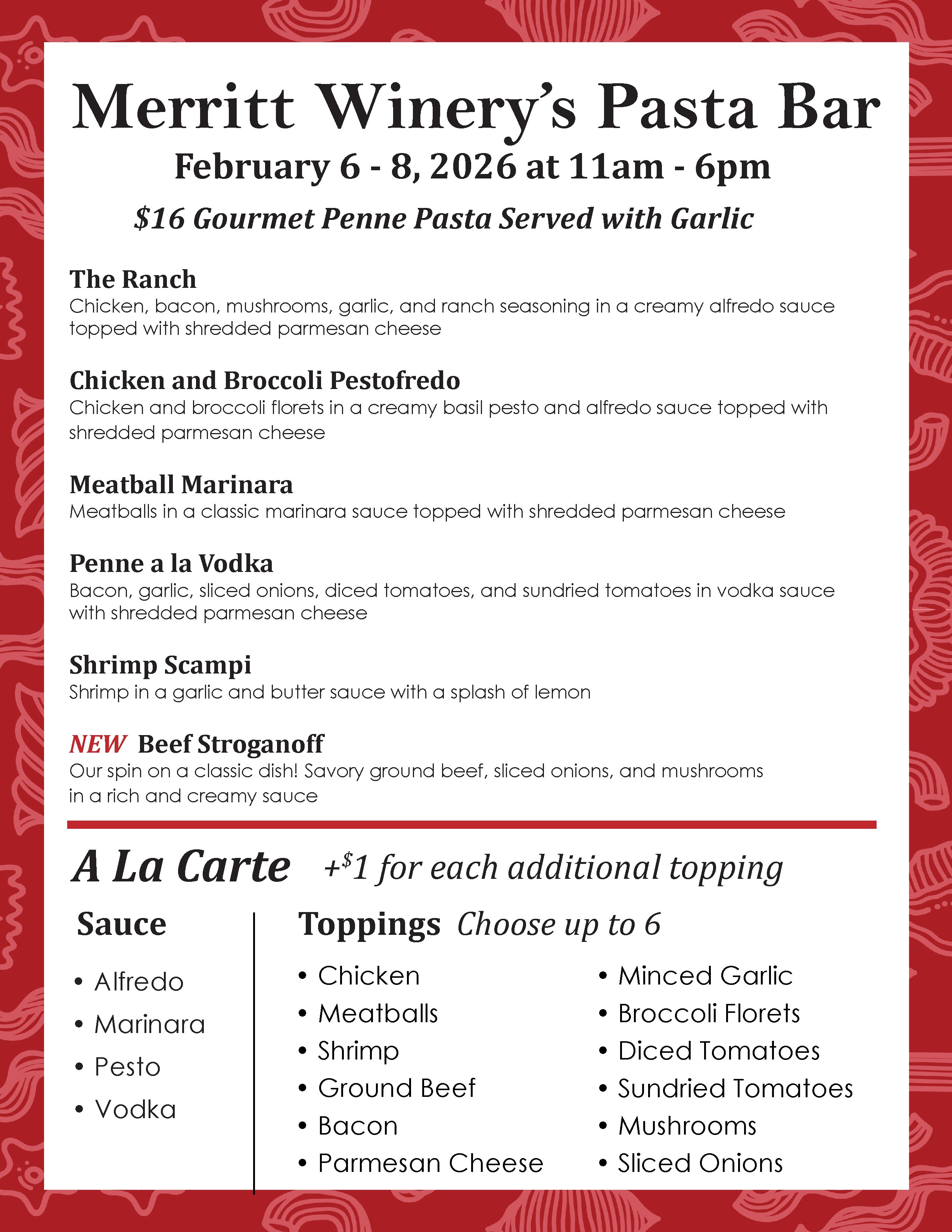 Get made-to-order pasta dishes with your choice of toppings. Enjoy it with a glass of Merritt wine!